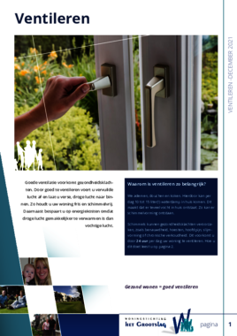 Goede ventilatie voorkomt vochtproblemen en schimmel in uw woning. Door constant en goed te ventileren voert u vervuilde lucht af en laat u verse, droge lucht naar binnen. Dat is goed voor uw gezondheid en uw woning. Doordat verse en droge lucht gemakkelijker verwarmt, bespaart u op energiekosten. Meer informatie leest u in de brochure